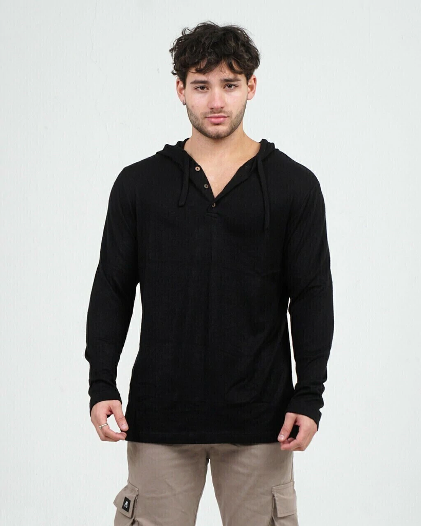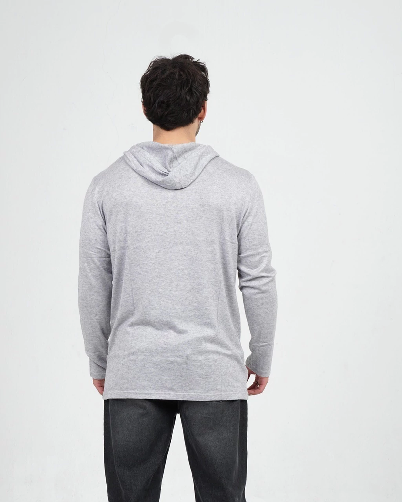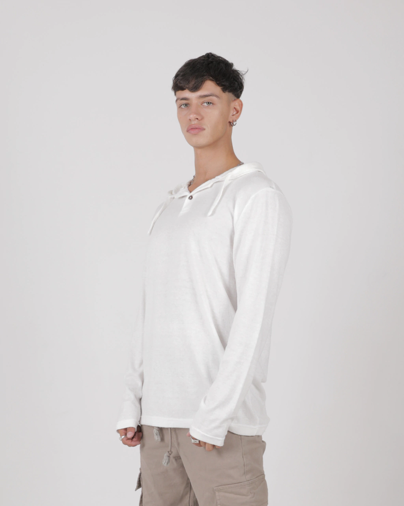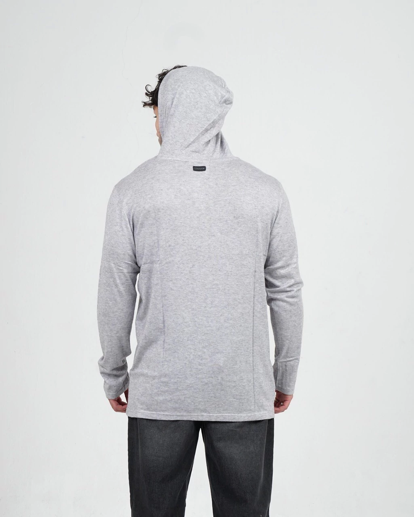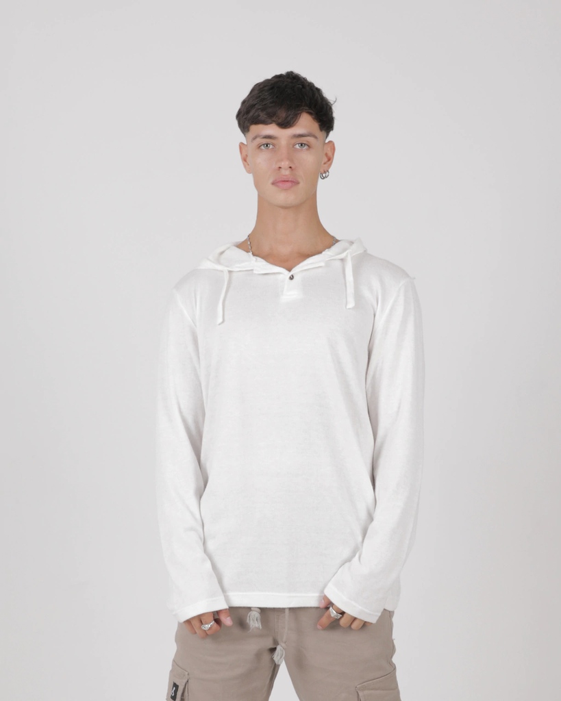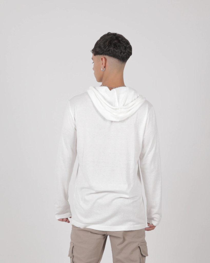 Sweater confeccionado en lanilla 100% poliéster. Tiene capucha y es un modelo al cuerpo.