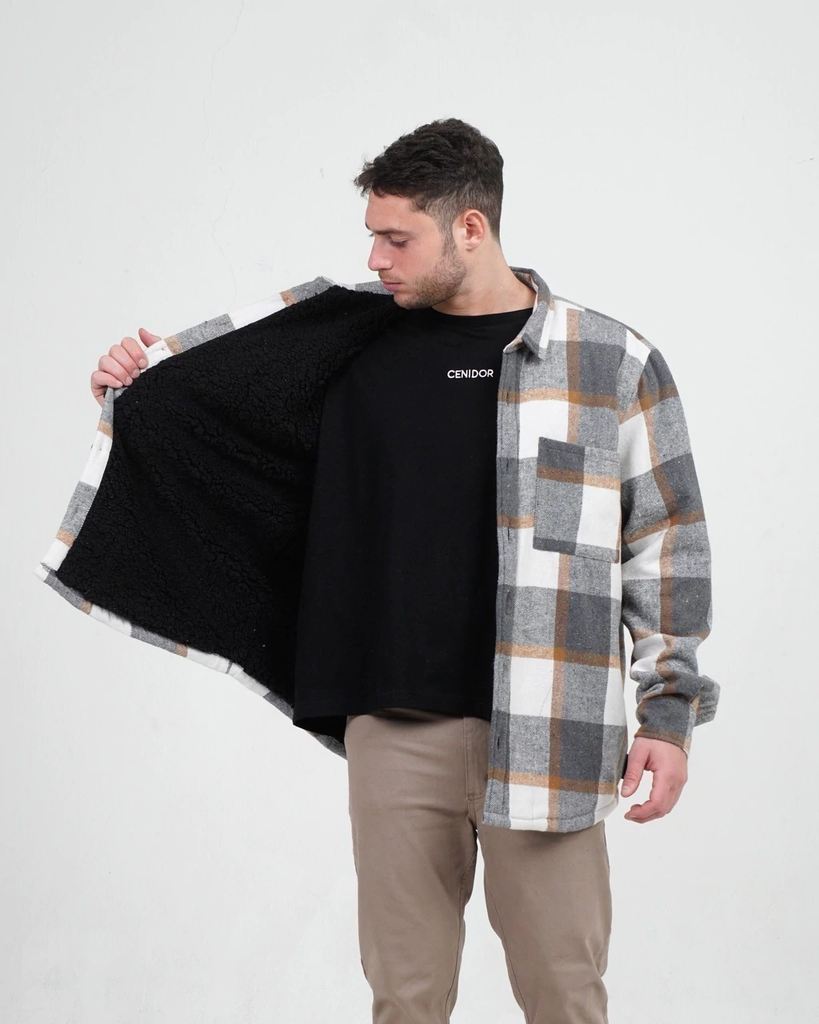 Camisaco de corte amplio invernal, confeccionado en paño escocés, forrado con corderito en su interior y con matelasse en las mangas. Contiene bolsillos delanteros y botones a tono.