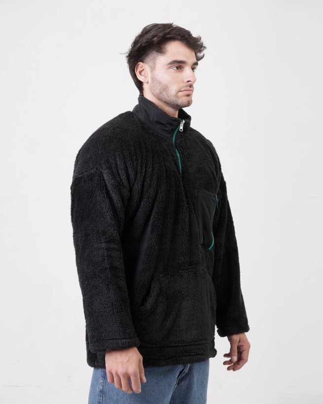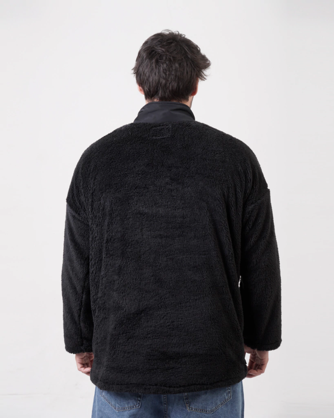 Buzo de corderito soft con medio cierre. Bolsillos canguro y bomber al frente con cierre a contratono.