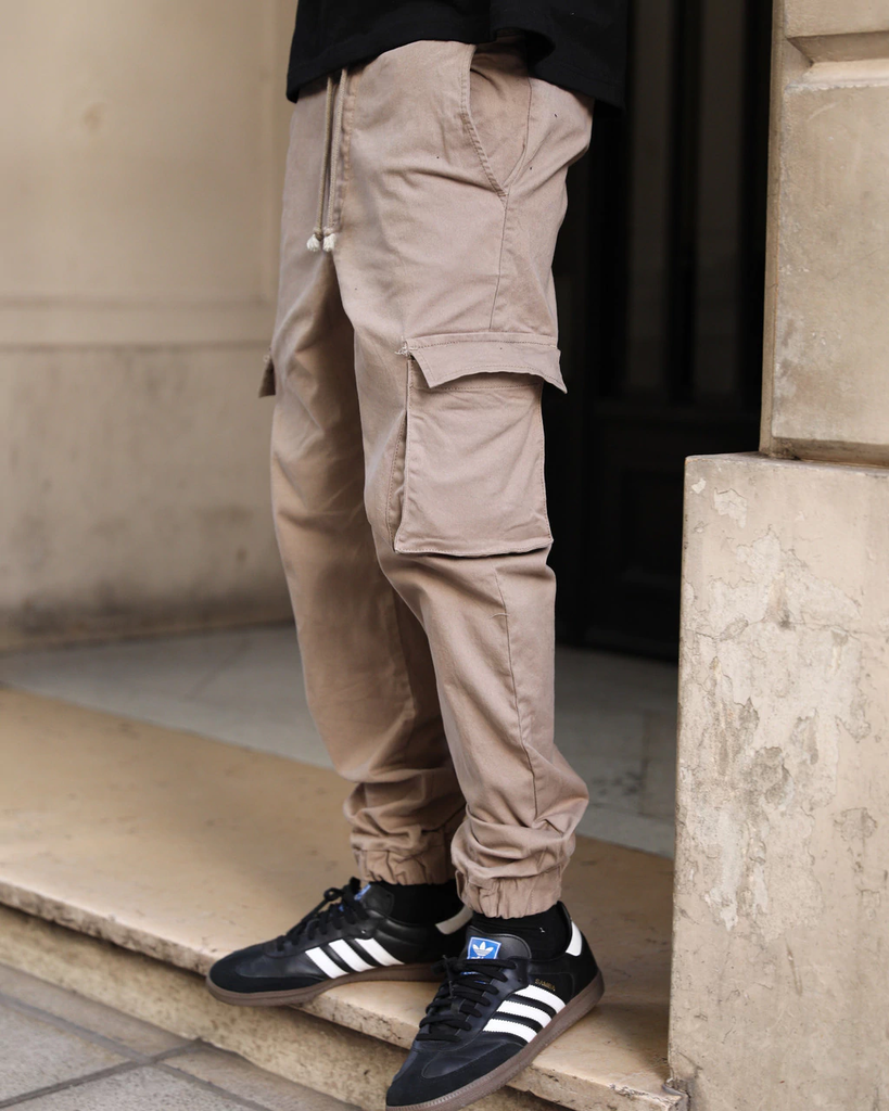 Tiene dos bolsillos cargo con solapa a los costados y tiene elastico en cintura y puños.