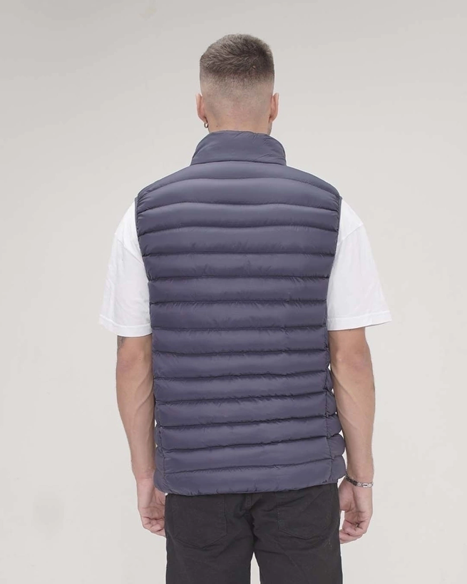 Chaleco puffer sintetico, con cierre frontal, bolsillos laterales y eslástico en la cintura.