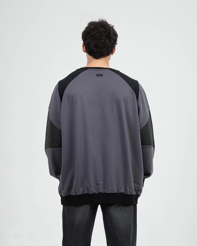Buzo cuello redondo, manga ranglan con coderas matelaseé de cuero ecológico. Cuerpo rústico de algódon con recortes.